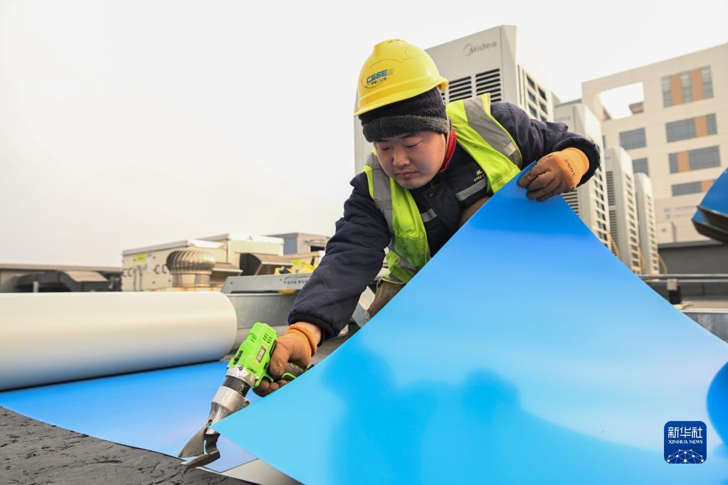 在天津“細胞谷”項目建設現場(chǎng),建設者裁剪外部保溫材料(2月10日攝)。