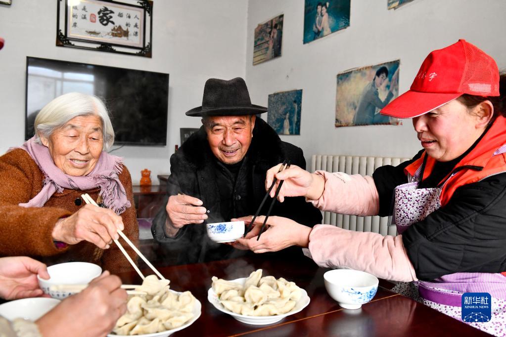 2月12日,在鄆城縣鄆州街道王沙灣村,鄆城縣居家養老服務(wù)中心的工作人員劉愛(ài)雪陪魏金蘭(左一)、沈宜明(中)一起吃餃子。