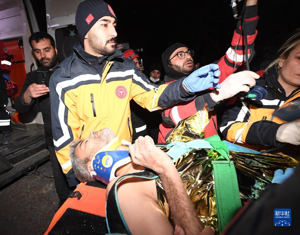 2月11日,救援人員在土耳其哈塔伊省安塔基亞市轉移幸存者。