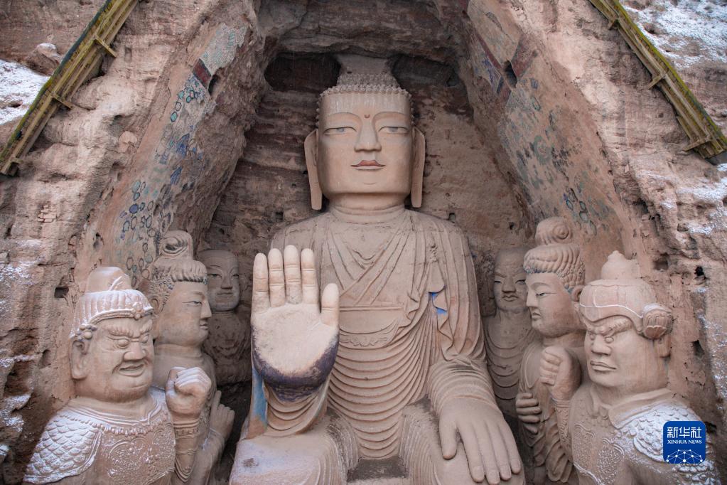 當日,位于甘肅省武威市涼州區的天梯山石窟迎來(lái)一場(chǎng)降雪。在皚皚白雪映襯下,窟區造像與原野山川構成一幅寧謐而優(yōu)美的畫(huà)卷。