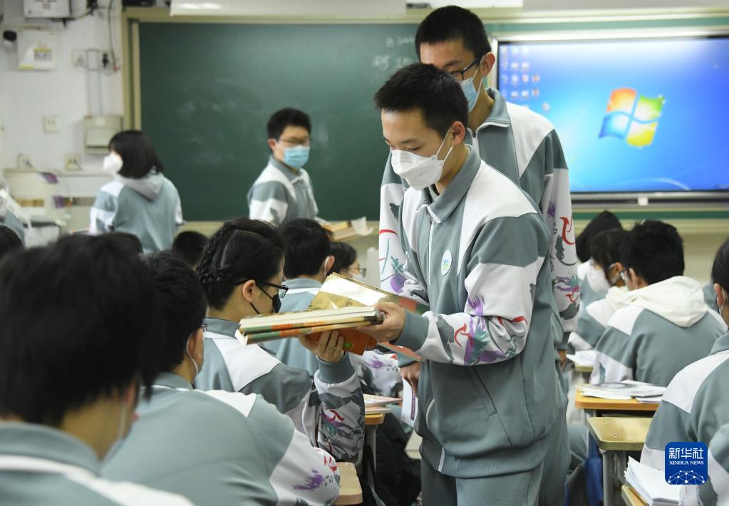 2月13日,在北京市中關(guān)村中學(xué)知春分校高一(1)班,學(xué)生在分發(fā)新學(xué)期教材。