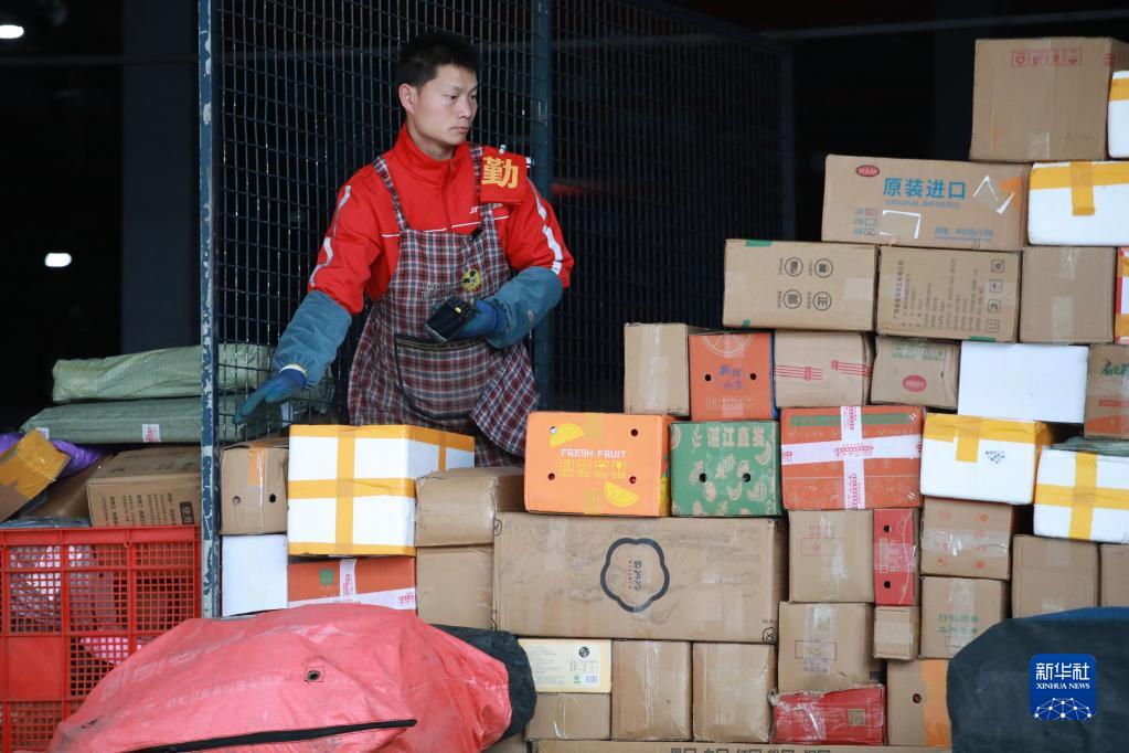 2月13日,工作人員正在貴州快遞物流園內分揀快遞。