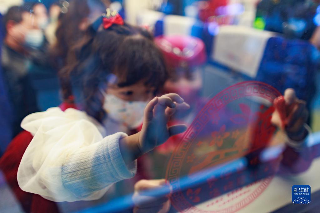 1月13日,一名小旅客在貴陽(yáng)北開(kāi)往成都南的C5980次復興號高鐵列車(chē)上貼窗花。