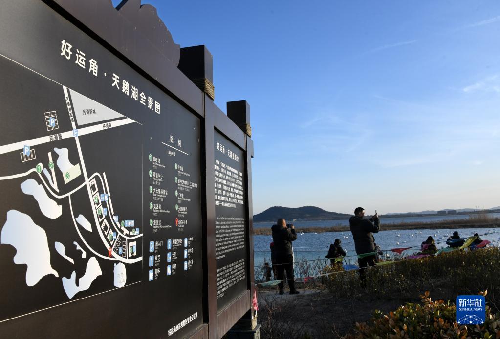 游客在榮成市大天鵝國家級自然保護區內的好運角·天鵝湖游玩、拍攝(2月14日攝)。