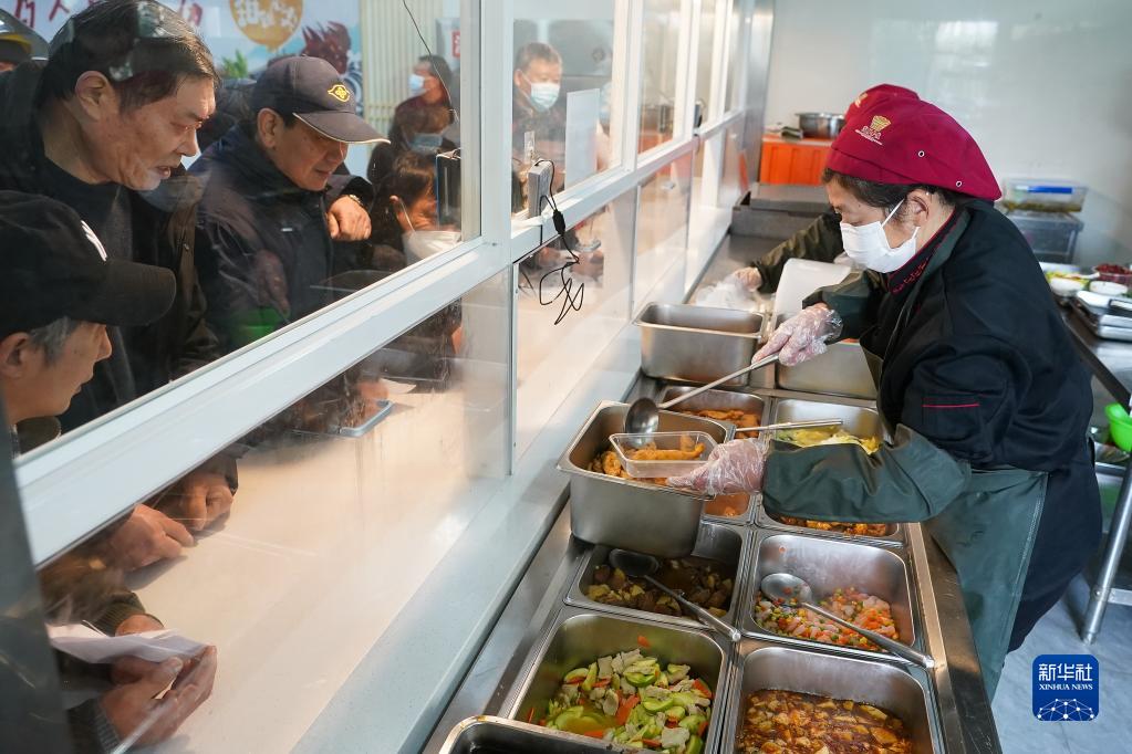 2月15日,鄰里紅餐廳服務(wù)員為居民打菜。