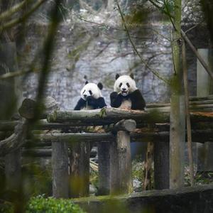 2月15日,在中國大熊貓保護研究中心都江堰基地,大熊貓在吃竹子。