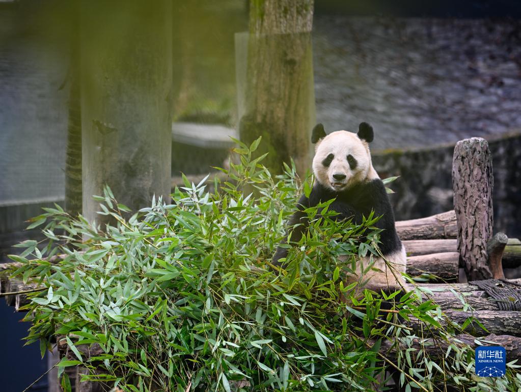 2月15日,在中國大熊貓保護研究中心都江堰基地,大熊貓在吃竹子。