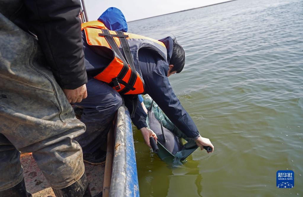 在江西鄱陽(yáng)湖松門(mén)山水域,工作人員將一頭不符合遷移條件的江豚放歸(2月15日攝)。