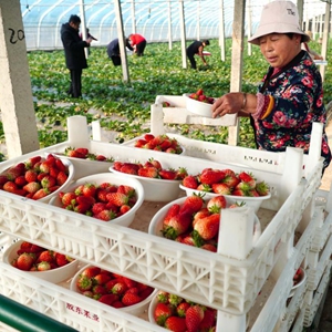 2月16日,在山東省東平縣無(wú)鹽村的草莓種植大棚,村民整理采摘的草莓。