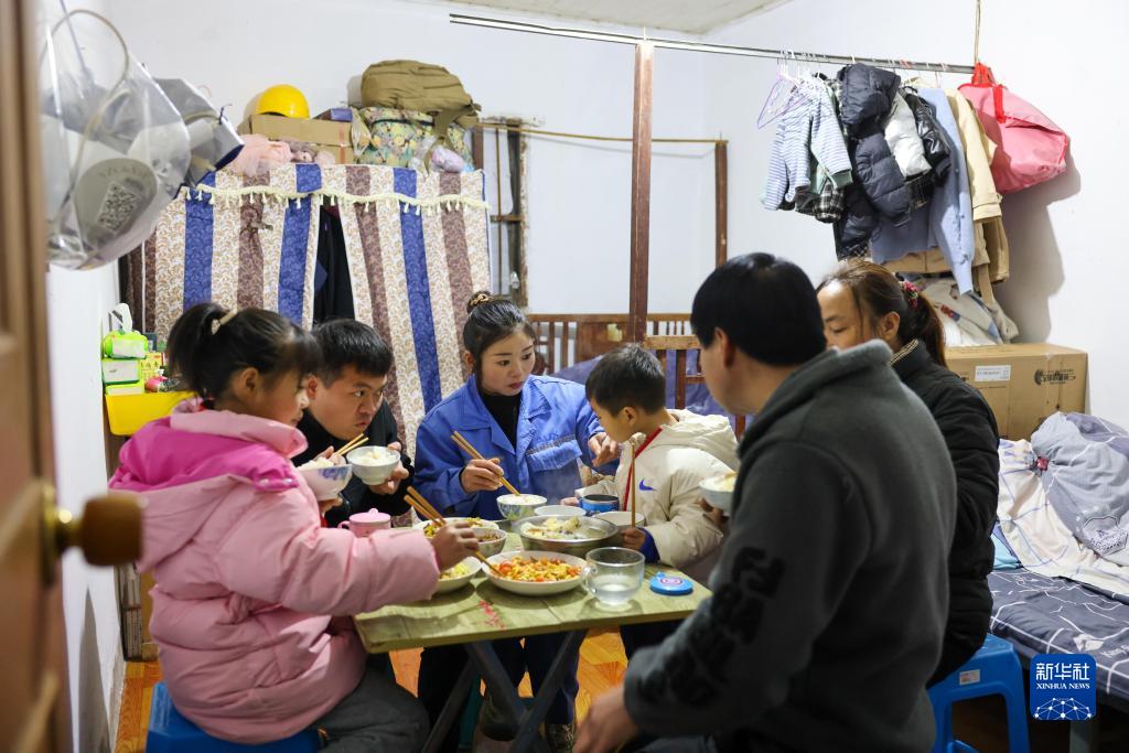 2月16日,岑福珍(左三)一家人在出租屋內吃晚餐。