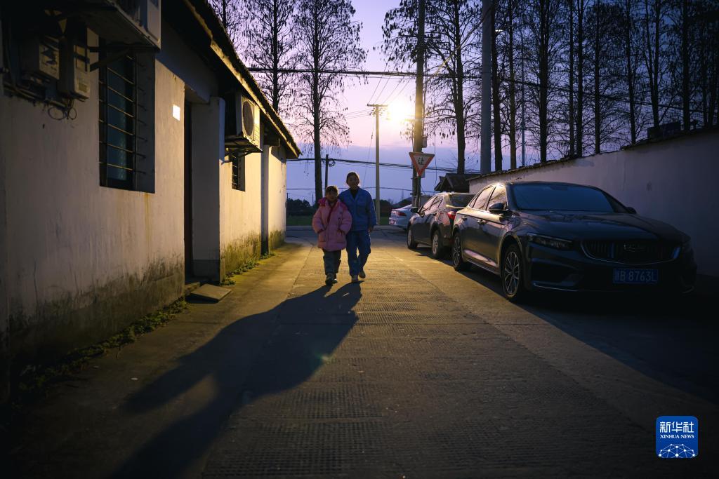 2月16日傍晚,岑福珍(右)陪伴女兒羅先妍在租住處所在的村子里散步。