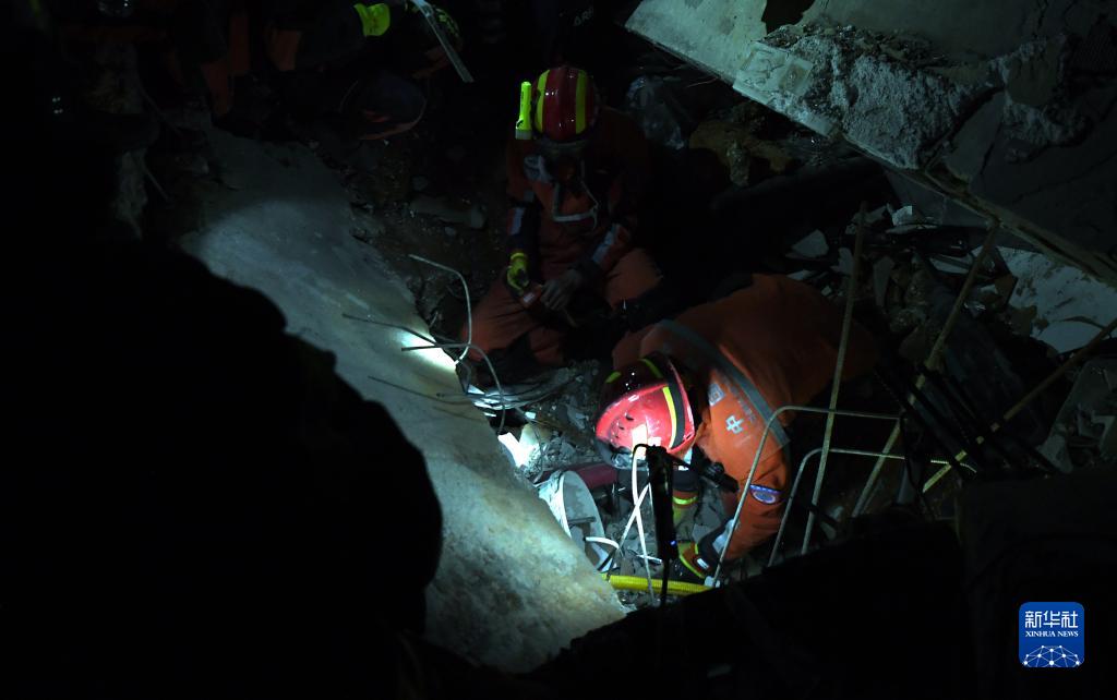 2月9日,中國救援隊隊員在土耳其哈塔伊省安塔基亞市開(kāi)展救援工作。