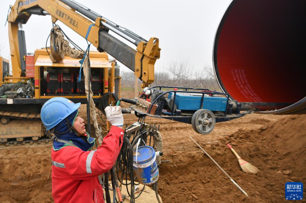2月16日,施工人員在位于陜西省咸陽(yáng)市禮泉縣的西氣東輸三線(xiàn)工程陜西段管道鋪設施工現場(chǎng)作業(yè)。