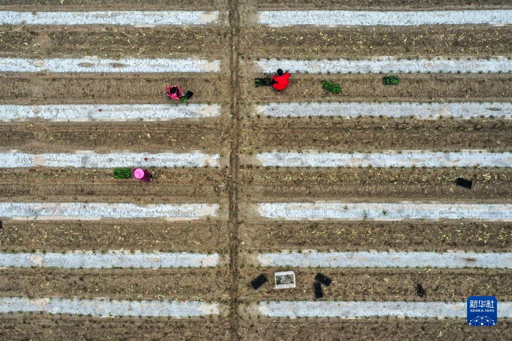 2月17日,農民在江蘇省南通市如東縣大豫鎮一處農田移栽西蘭花幼苗(無(wú)人機照片)。
