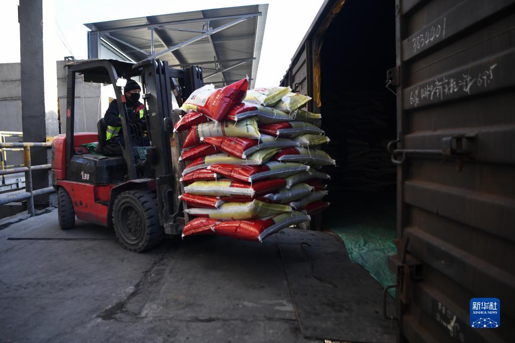 2月17日,在甘肅省金昌市一企業(yè)鐵路專(zhuān)用線(xiàn)上,工作人員駕駛叉車(chē)將化肥裝車(chē)。