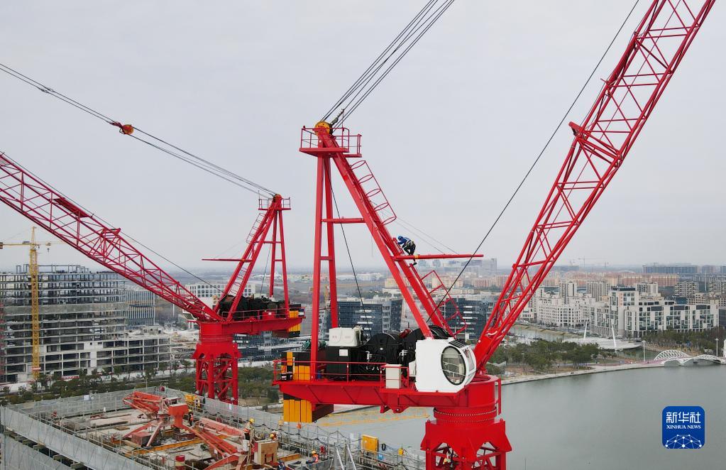2月17日,在位于中國(上海)自由貿易試驗區臨港新片區的中建二局臨港西島中銀金融中心項目工地,一名智能造樓機動(dòng)力臂駕駛員在進(jìn)行鋼纜安全例行檢查(無(wú)人機照片)。
