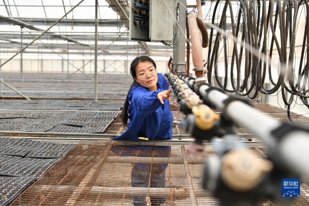 2月17日,張莎莎在連棟育苗溫室內查看噴灌設施。