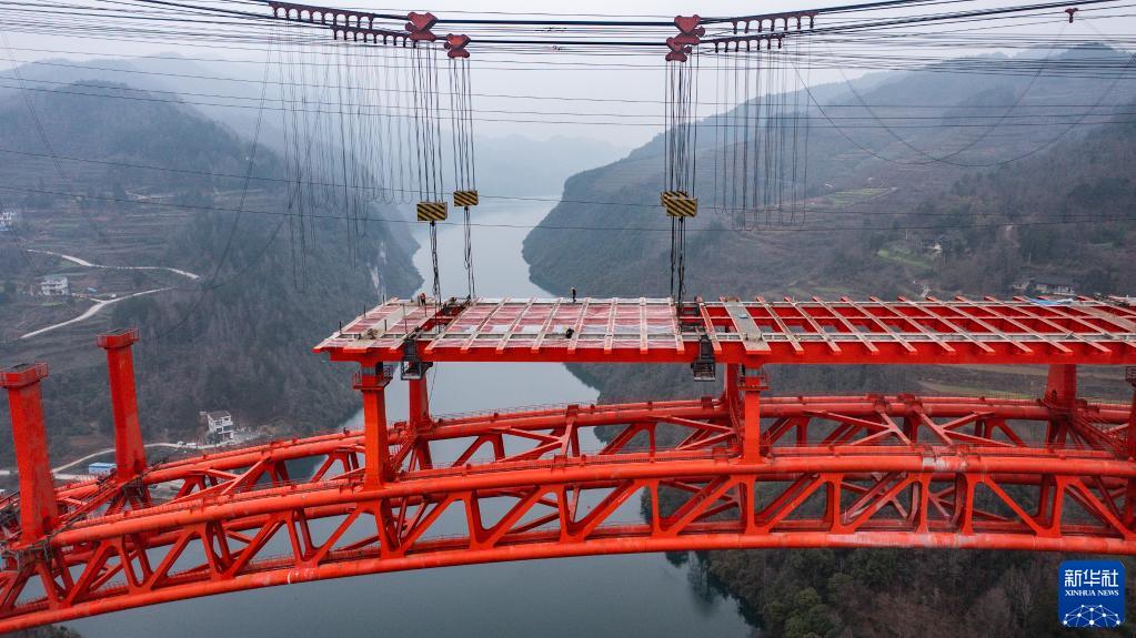 正在進(jìn)行橋面系施工的德余高速烏江特大橋(2月17日攝,無(wú)人機照片)。