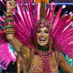 2月17日晚,在巴西里約熱內盧桑巴大道,一名桑巴舞校演員參加狂歡節游行。