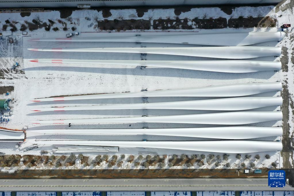 這是2月18日在武威市涼州區一家風(fēng)電裝備生產(chǎn)企業(yè)拍攝的風(fēng)機葉片成品(無(wú)人機照片)。