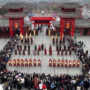 2月18日,游客在開(kāi)封清明上河園景區觀(guān)看民俗表演(無(wú)人機照片)。