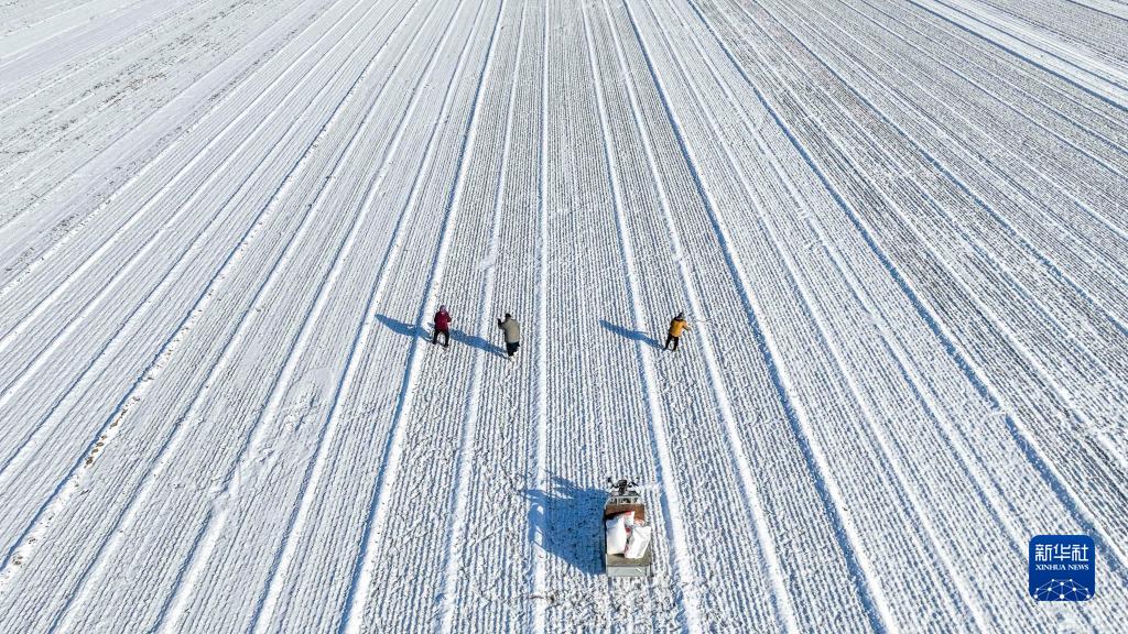 2月19日,河北省遵化市東新莊鎮農民在為麥田施肥(無(wú)人機照片)。