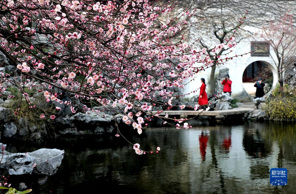 2月19日,游客在江蘇蘇州古典園林藝圃?xún)荣p梅拍照。