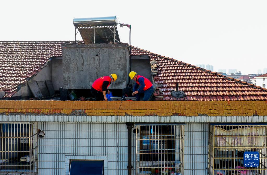 2月20日,在余姚市古建小區屋頂,余姚市大城小愛(ài)公益服務(wù)中心的志愿者在安裝光伏發(fā)電板(無(wú)人機照片)。
