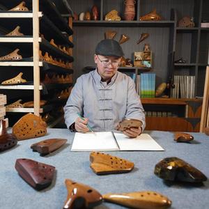 2月20日,陶笛藝人侯義敏在設計木質(zhì)陶笛。