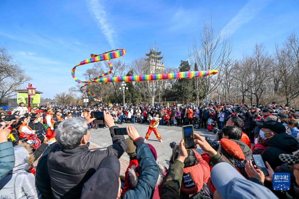2月21日,在天津市水上公園,市民群眾觀(guān)看民間藝人表演空竹舞龍。