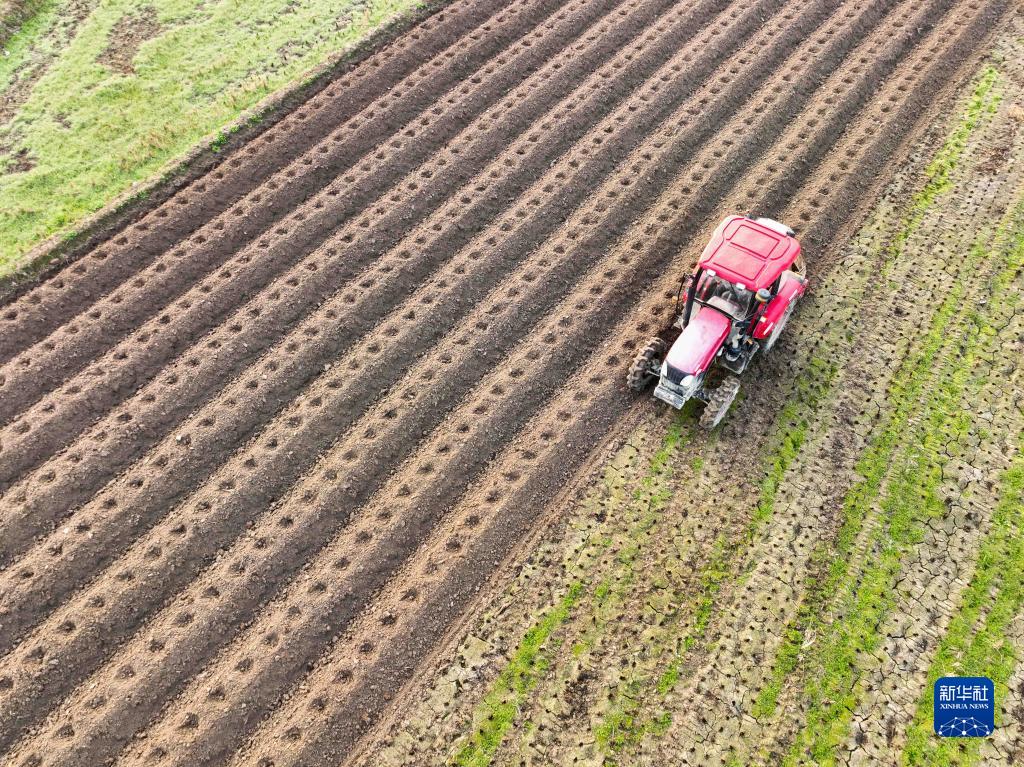 2月21日,在湖南省永州市道縣梅花鎮斯屋村,農民駕駛農機翻耕農田(無(wú)人機照片)。