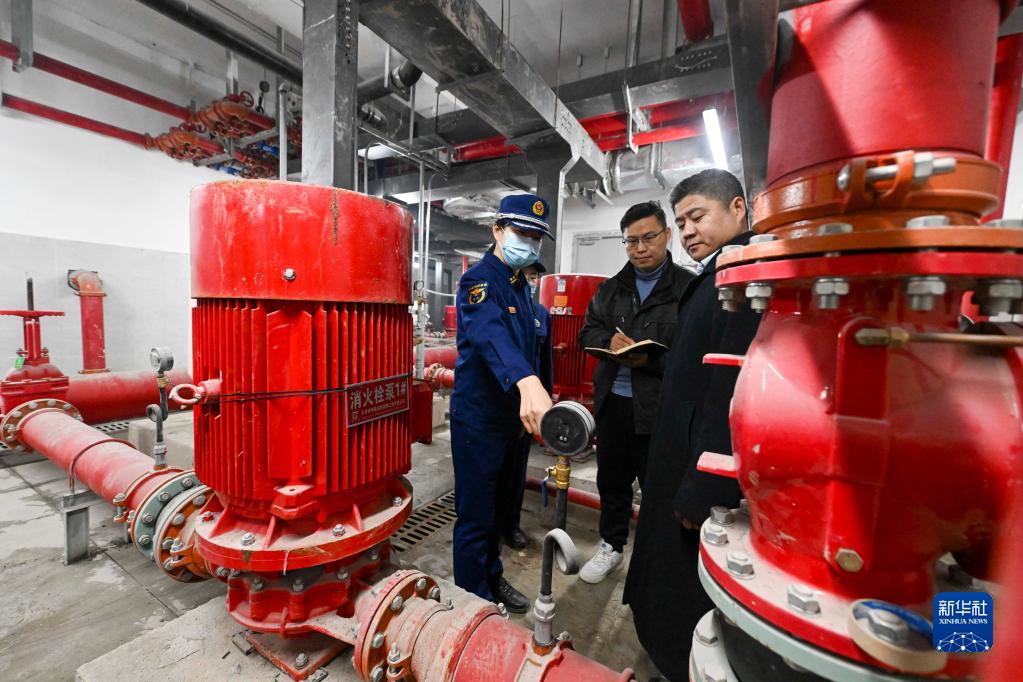 2月22日,在天津市河西區中海環(huán)宇城購物中心,天津市河西區消防救援支隊聯(lián)合物業(yè)工作人員檢查消防栓泵房安全運營(yíng)情況。