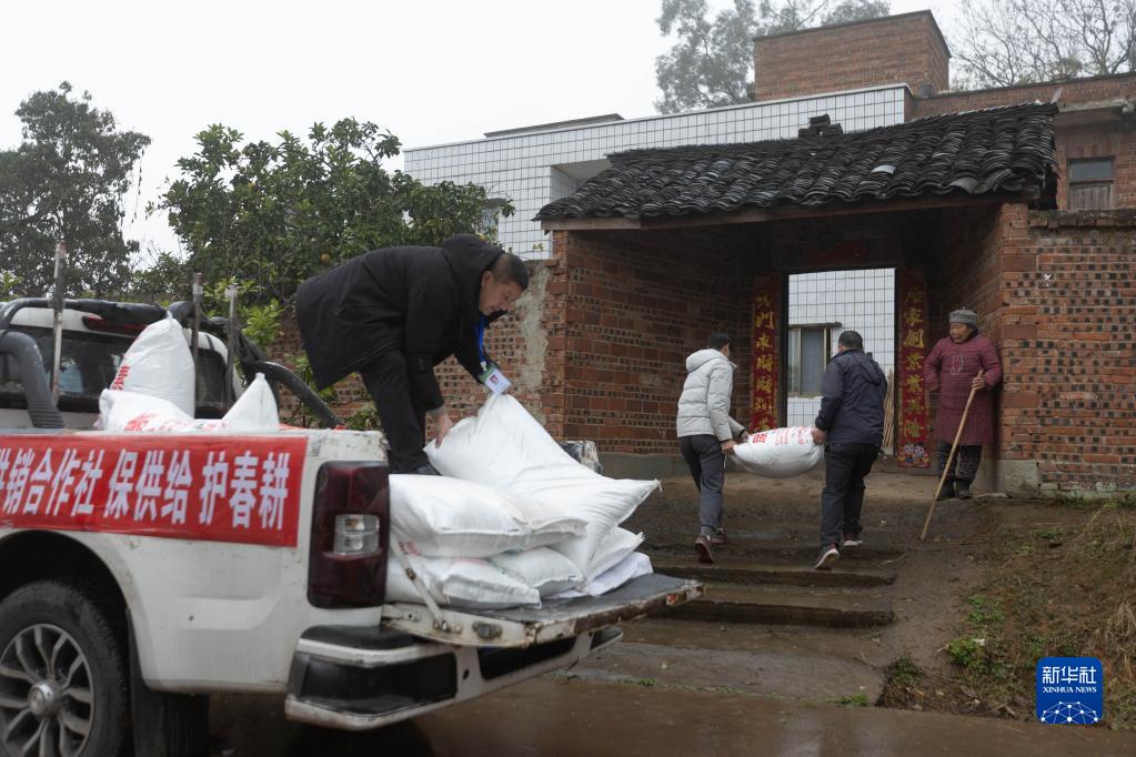 2月22日,四川省瀘縣供銷(xiāo)合作社農資服務(wù)員把化肥和種子送到云錦鎮稻子村秦治華家中。