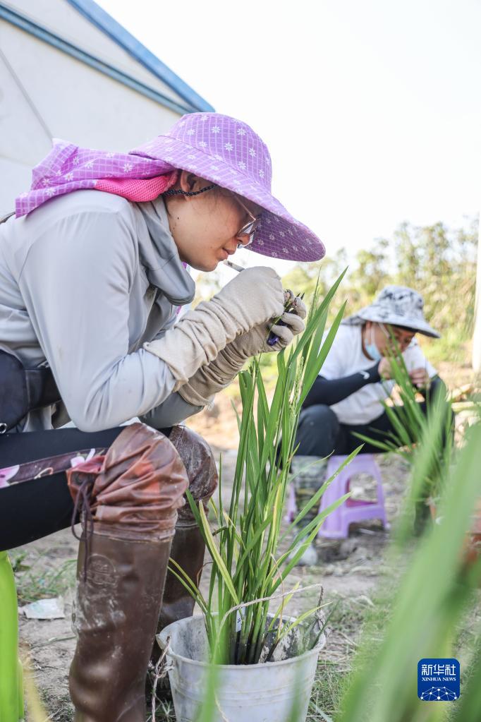 2月22日,青島海水稻研究發(fā)展中心的科研人員在海南三亞的國家南繁科研育種基地里做水稻雜交實(shí)驗。