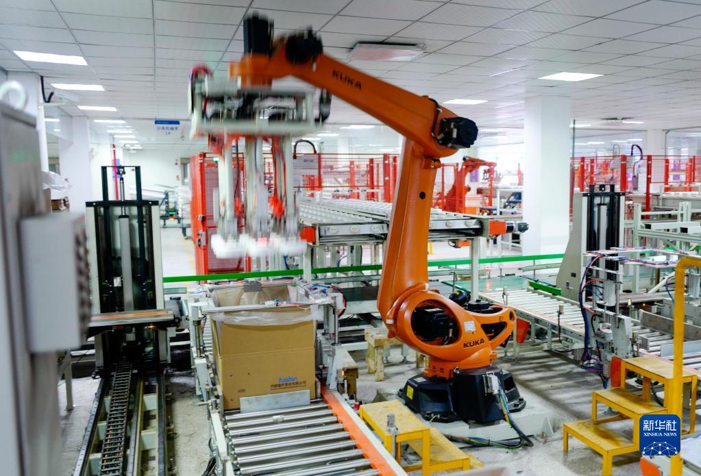 2月21日,重慶涪陵區白濤新材料科技城華峰重慶氨綸有限公司包裝車(chē)間內的工業(yè)機器人在作業(yè)。