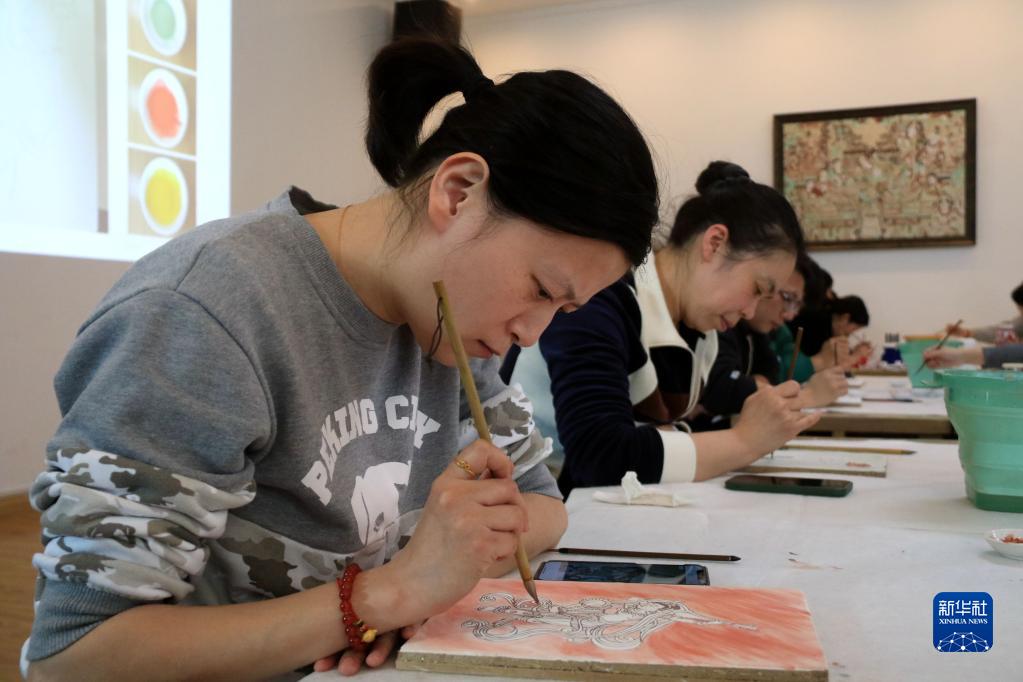 近年來(lái),甘肅省敦煌研究院依托敦煌石窟資源和學(xué)術(shù)資源,打造“莫高學(xué)堂”研學(xué)品牌,結合敦煌壁畫(huà)的結構、巖彩、圖案等內容和元素,研發(fā)了“莫高夢(mèng)·泥胚典藏”、“遇見(jiàn)敦煌·色彩”等10余個(gè)獨具特色的研學(xué)課程,傳承弘揚敦煌文化,推動(dòng)文旅產(chǎn)業(yè)融合發(fā)展,讓游客在旅游參觀(guān)同時(shí)進(jìn)一步體驗敦煌文化。莫高學(xué)堂自2019年創(chuàng )辦以來(lái),累計有5萬(wàn)余人次參加敦煌文化研學(xué)體驗。新華社發(fā)(張曉亮 攝)