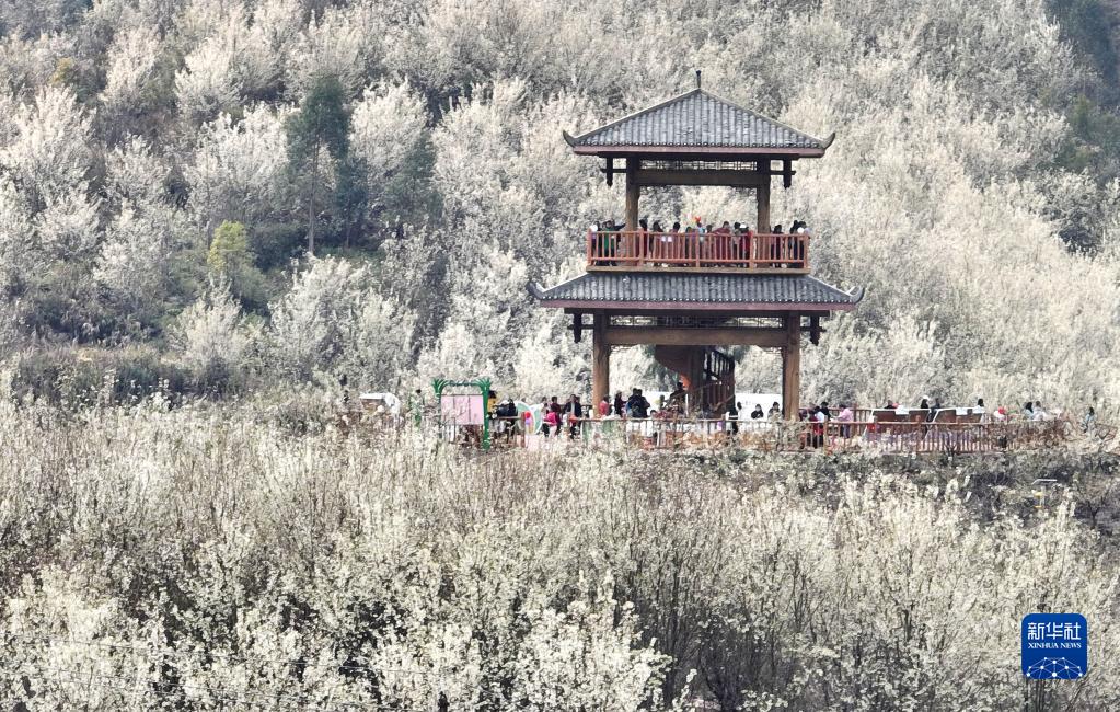 2月18日,游客在廣西柳州市鹿寨縣導江鄉山楂林中賞花休閑(無(wú)人機照片)。