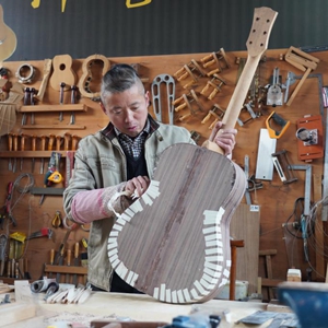 2月26日,吉他藝人在河北省武強縣周窩音樂(lè )小鎮一家吉他工坊內制作吉他。