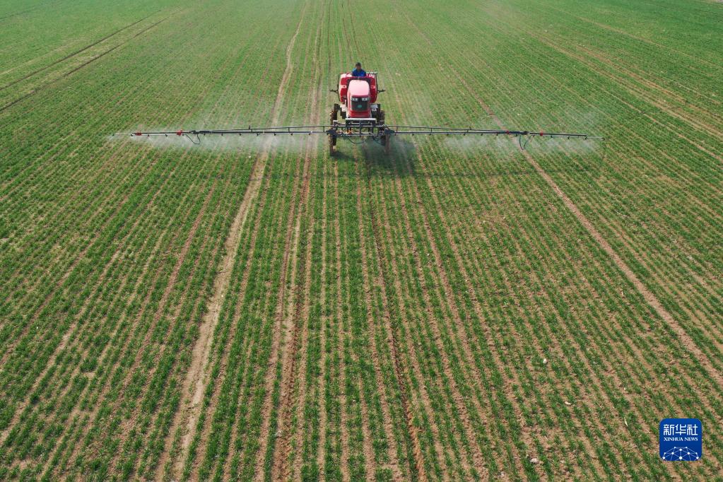 2月27日,河南省焦作市溫縣永生農業(yè)植保專(zhuān)業(yè)合作社植保隊員駕駛農機在給小麥噴施葉面肥(無(wú)人機照片)。