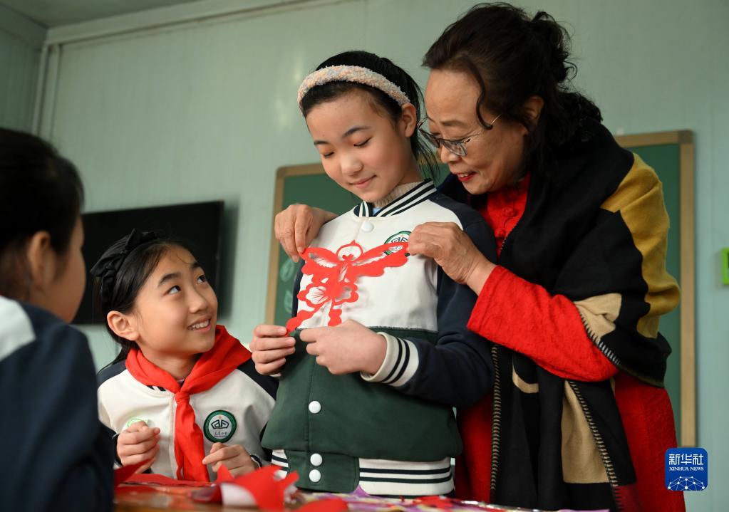 2月28日,國家級非遺蔚縣剪紙代表性傳承人周淑英(右一)在石家莊市東風(fēng)小學(xué)非遺工坊給學(xué)生展示剪紙作品。