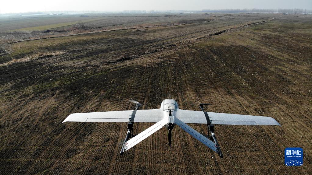 在萊西市夏格莊鎮數字農業(yè)產(chǎn)業(yè)園內,固定翼無(wú)人機在進(jìn)行土地航測,可實(shí)現地塊精準掃描制圖、多光譜掃描病蟲(chóng)害等功能,結合后臺數據信息平臺為農業(yè)生產(chǎn)提供數據支持和決策依據(2月28日,無(wú)人機照片)。