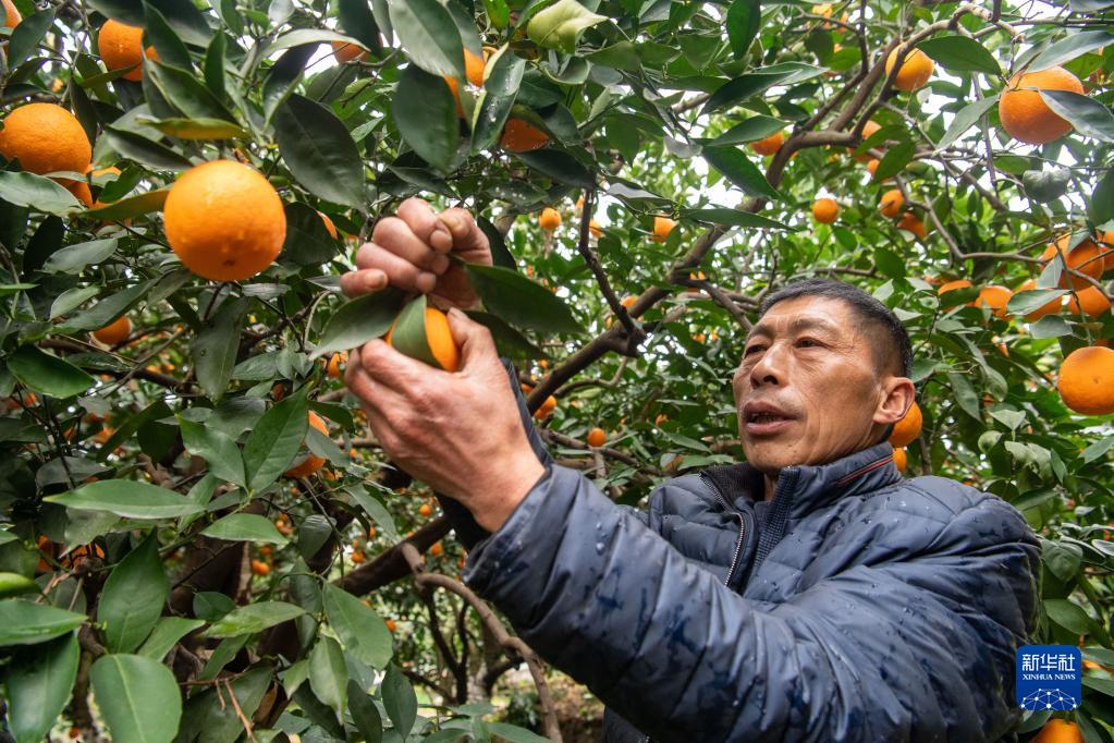 2月28日,在重慶市奉節縣永樂(lè )鎮大壩村的臍橙種植園內,農戶(hù)在采摘臍橙。