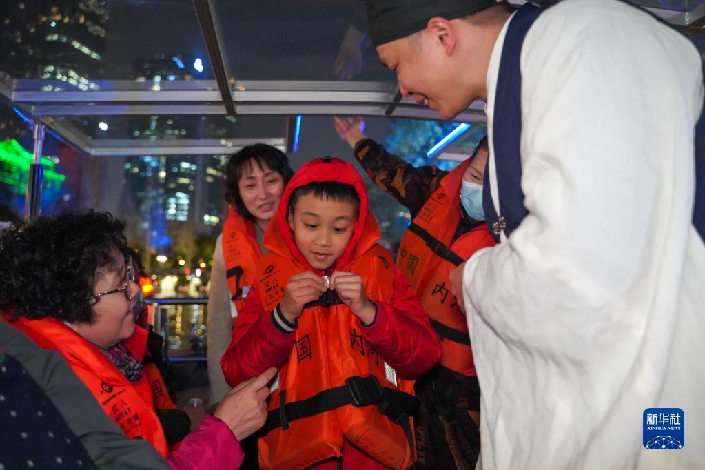 在四川省成都市“夜游錦江”游覽河段,工作人員在游船上與乘客互動(dòng)(3月1日攝)。