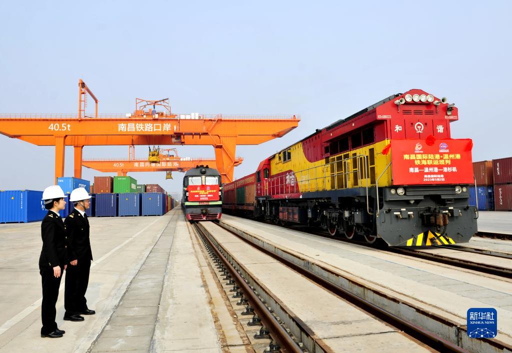 3月2日,“南昌-溫州港-洛杉磯”鐵海聯(lián)運班列(前)準備從南昌國際陸港鐵路口岸二期駛出。
