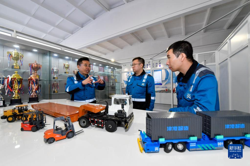 在天津港成衛東勞模創(chuàng )新工作室,成衛東(左)向徒弟們講述產(chǎn)業(yè)工人技術(shù)創(chuàng )新方向(2月17日攝)。