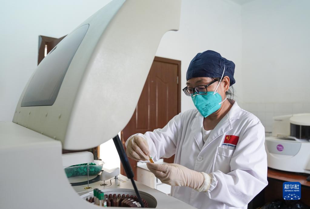 2月28日,在吉布提首都吉布提市貝爾蒂耶醫院,中國第21批援吉布提醫療隊醫生韓俊英檢驗血液樣本。