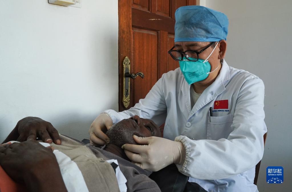 2月28日,在吉布提首都吉布提市貝爾蒂耶醫院,中國第21批援吉布提醫療隊醫生連新剛為當地患者診治。