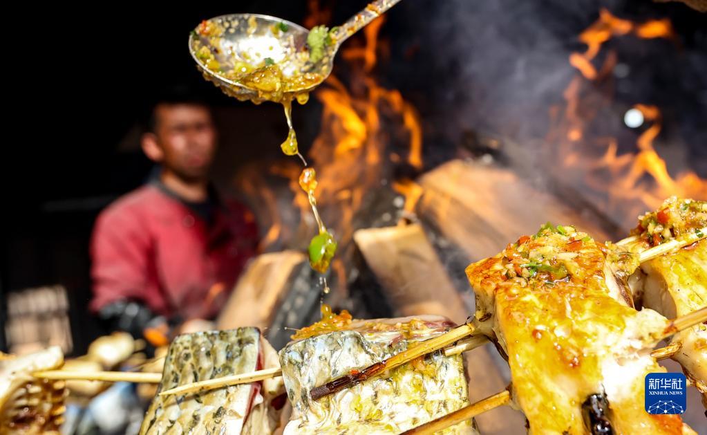 2月26日,在新疆喀什地區疏附縣托克扎克鎮農貿市場(chǎng)的一處攤位前,攤主給炙烤的魚(yú)塊淋上料汁。