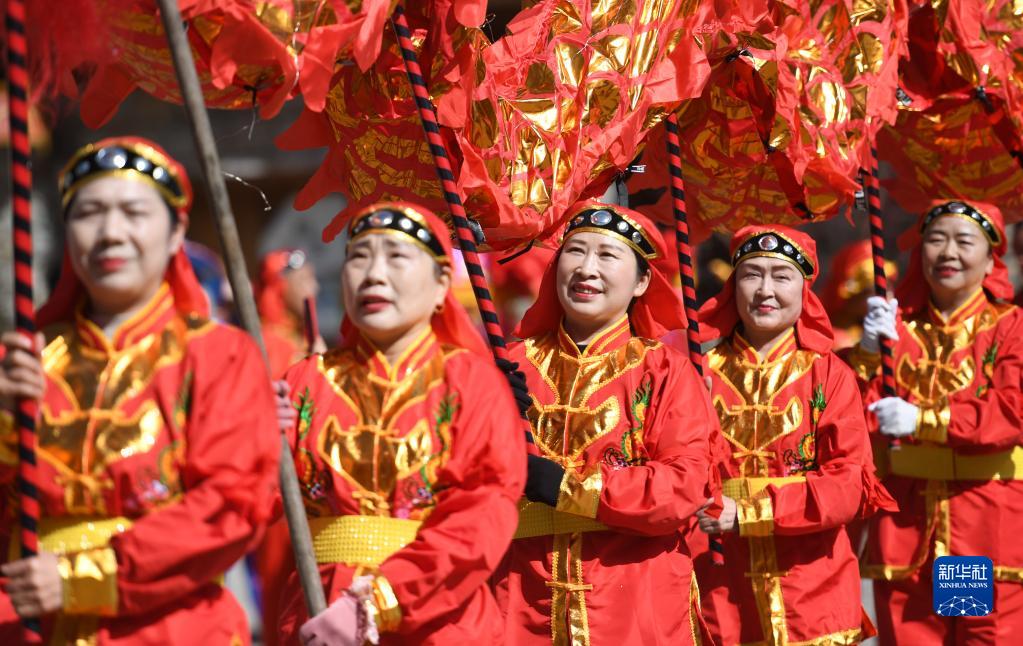 柞水縣終南山寨景區的工作人員進(jìn)行舞龍表演(3月4日攝)。