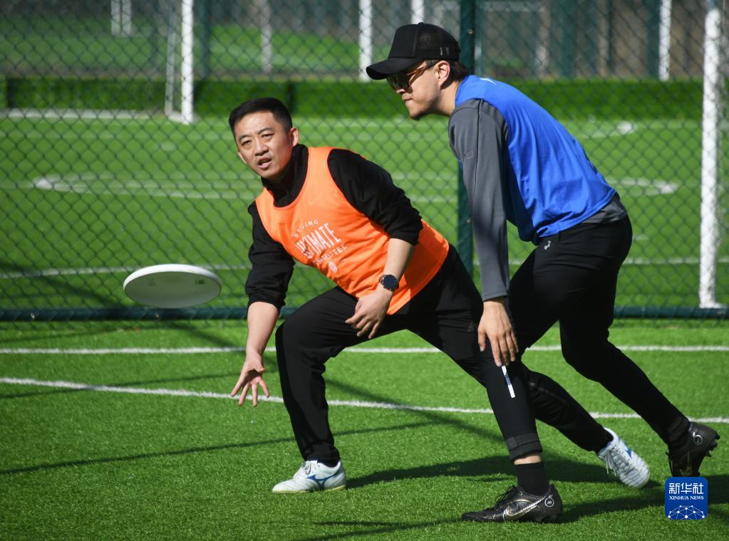 3月1日,在北京市朝陽(yáng)區的東楓國際體育園,飛盤(pán)愛(ài)好者進(jìn)行飛盤(pán)比賽。